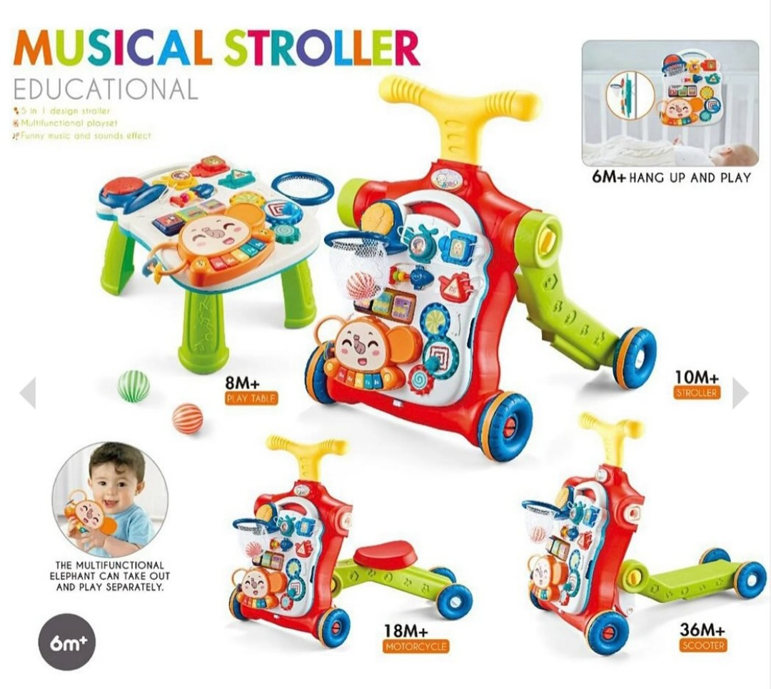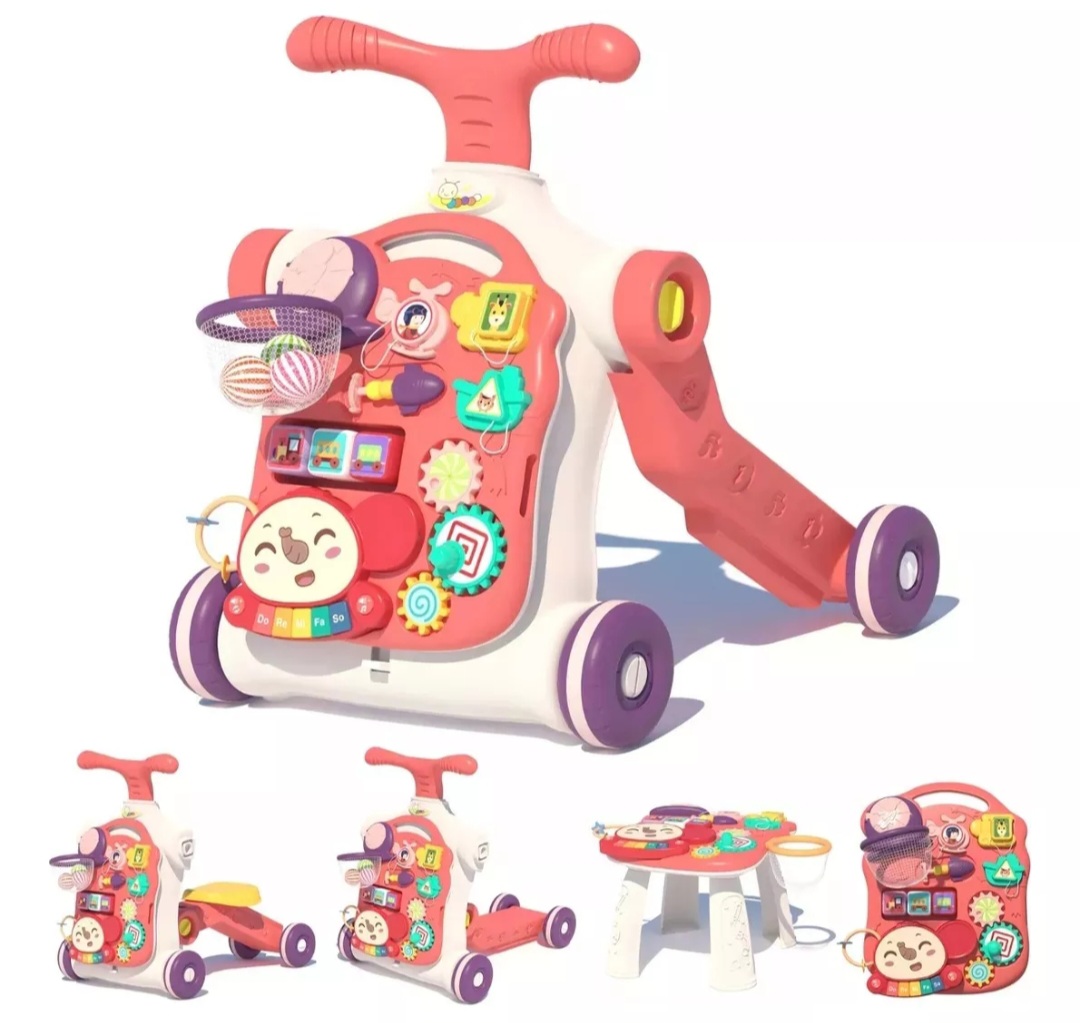 Caminador multifuncional diseñado para ayudar a los bebés a moverse y explorar su entorno antes de que puedan caminar de manera independiente. Se convierte en mesa didáctica, scooter, corre pasillo, tablero.