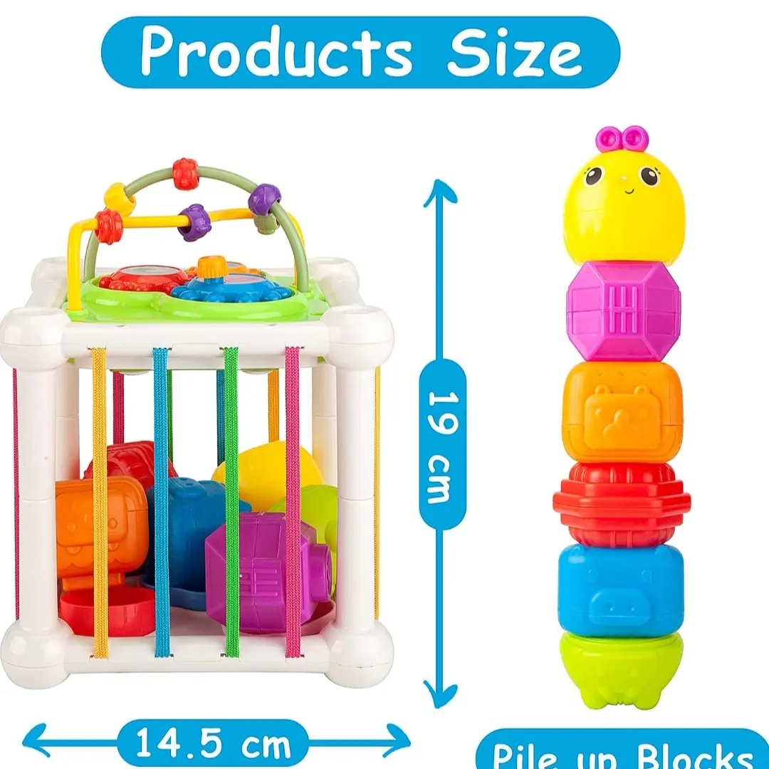 Entretenido cubo Montesori, con este nuevo diseño de cubo pueden realizar 6 actividades diferentes; clasificar formas, laberinto de cuentas,engranaje giratorio,tocando piano, cuerdas elástica y bloques apilables entre sus beneficios esta que ayuda a entrenar la coordinación ojo-mano y el movimiento fino.