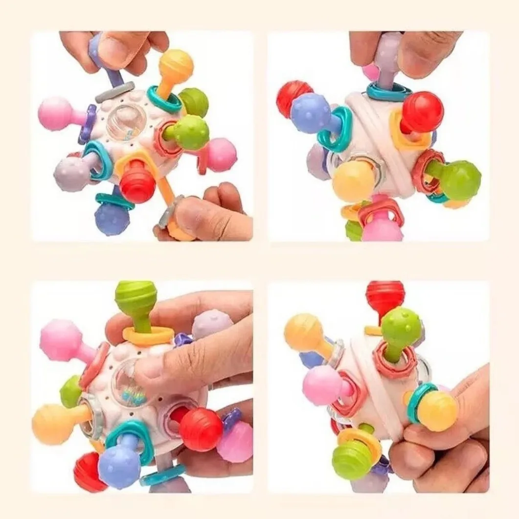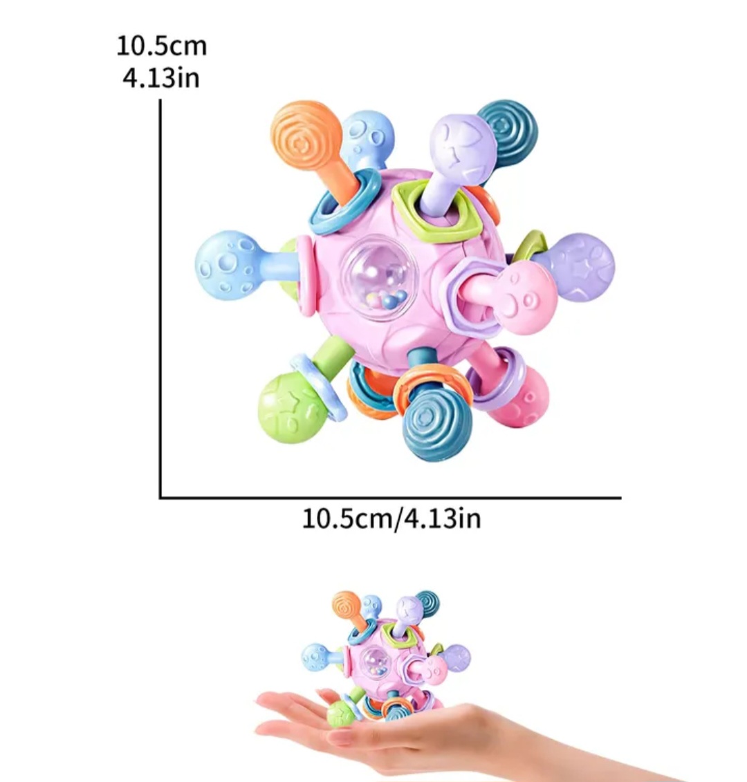 Pelota sonajero mordedor con distintas texturas, puede girar 360º, con sonidos llamativos y colorido.