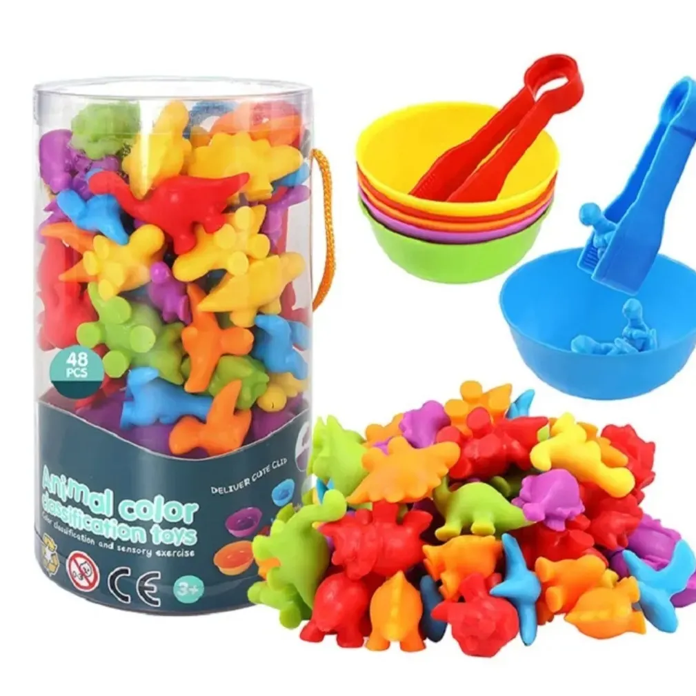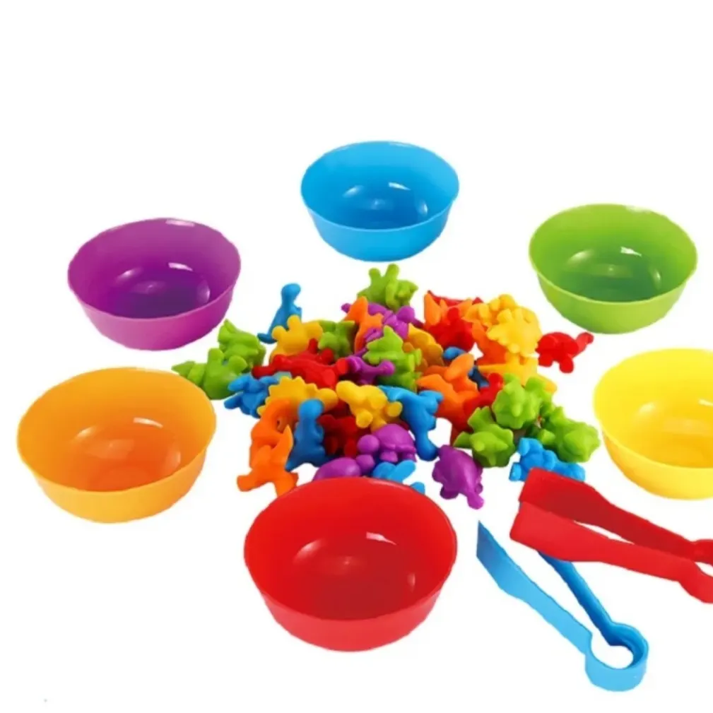 Este hermoso set ayuda a mejorar las habilidades motoras, el reconocimiento de colores, la coordinación mano-ojo y la rotación tridimensional usando pinzas o apilar tazones de diferentes formas.